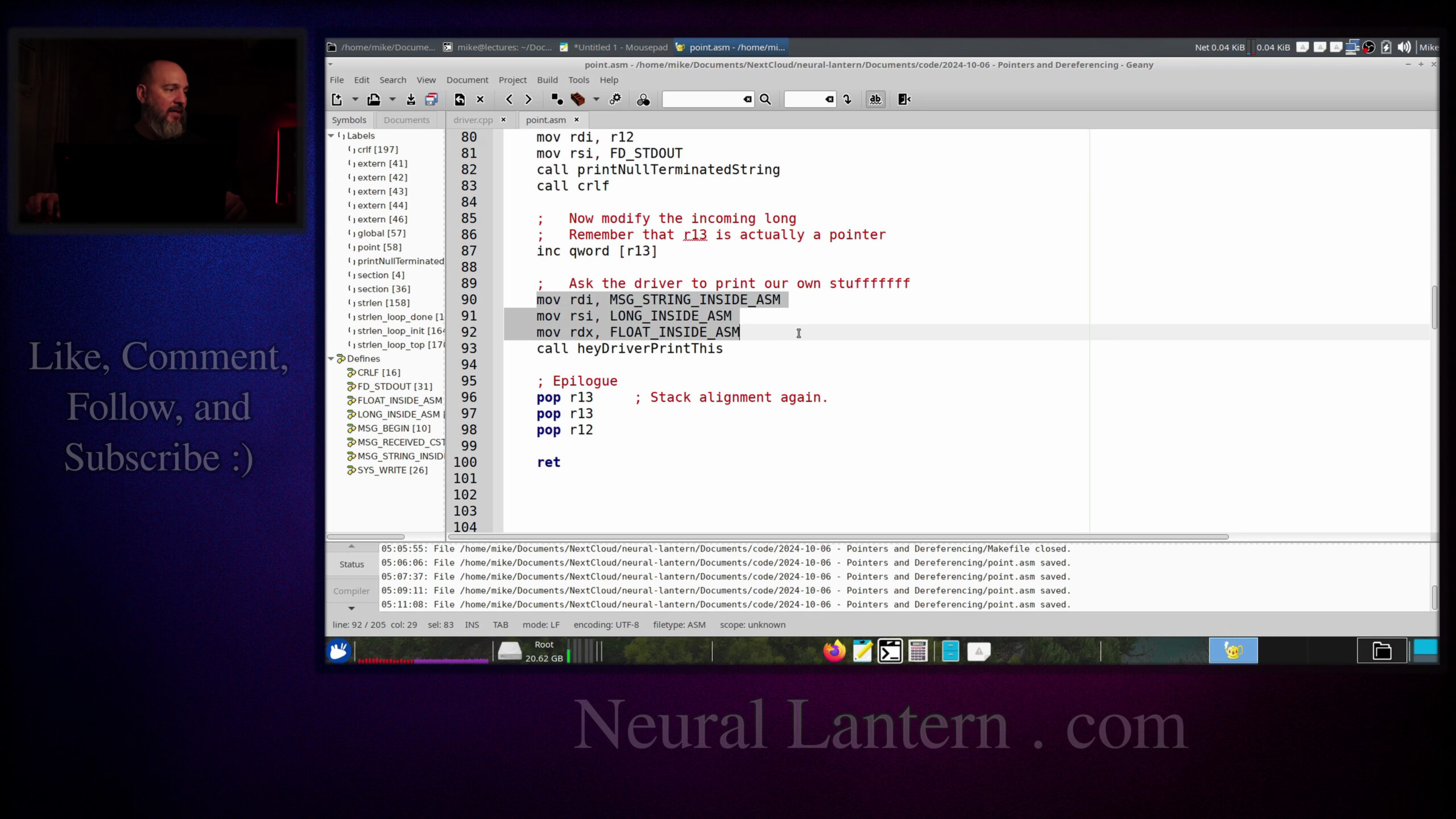 This video explains pointers and dereferencing in x86-64 YASM assembly and demonstrates passing pointers between assembly and C++ in a hybrid program. We show how to read a C string from assembly, modify a long via pointer dereference so the change is visible in C++, and send assembly-owned data (string, long, double) back to C++ using pointers.