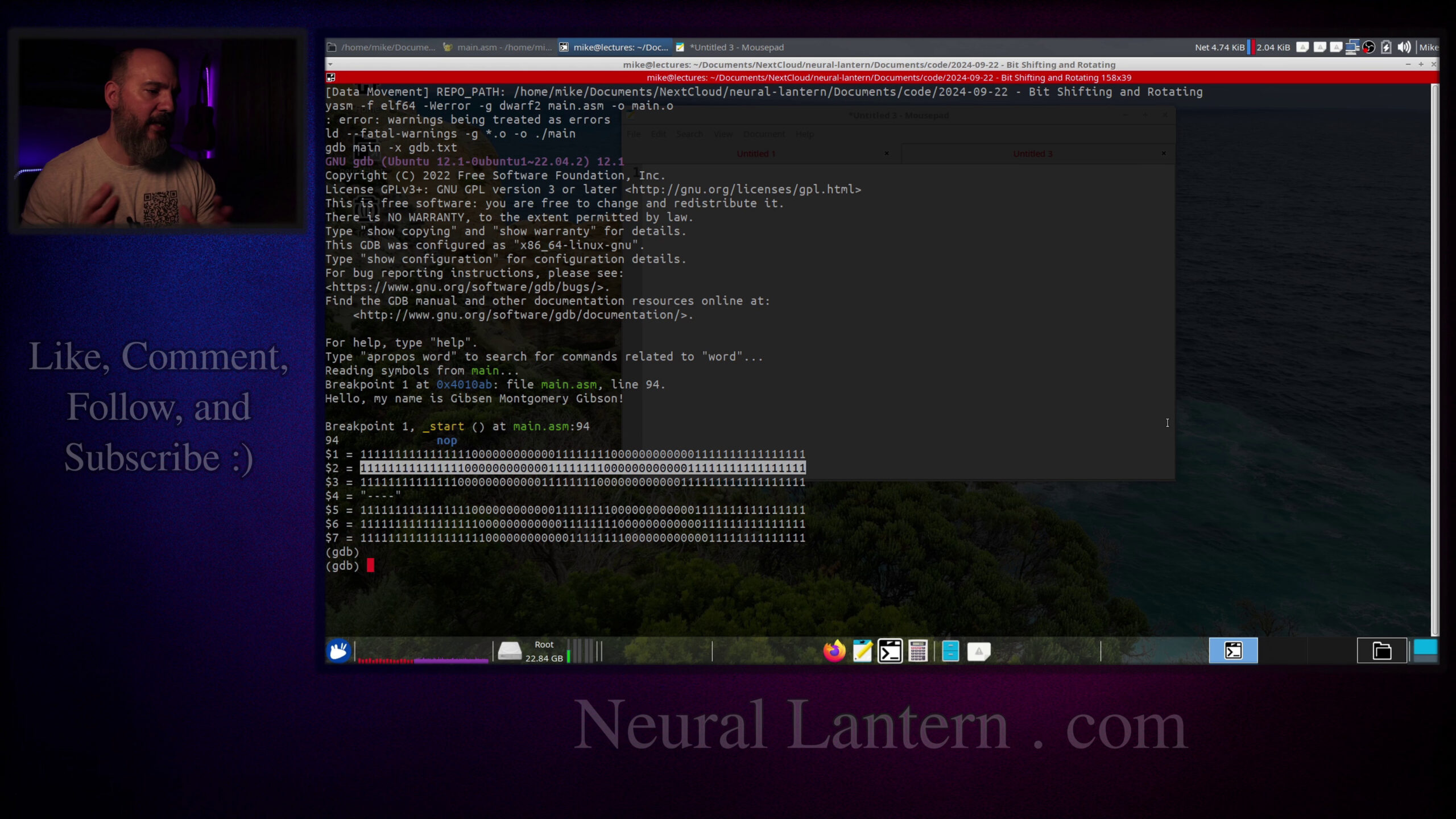 Learn bitwise operations in x86-64 assembly language including AND, OR, XOR, NOT, logical and arithmetic shifts, and bit rotations with practical examples and GDB debugging.