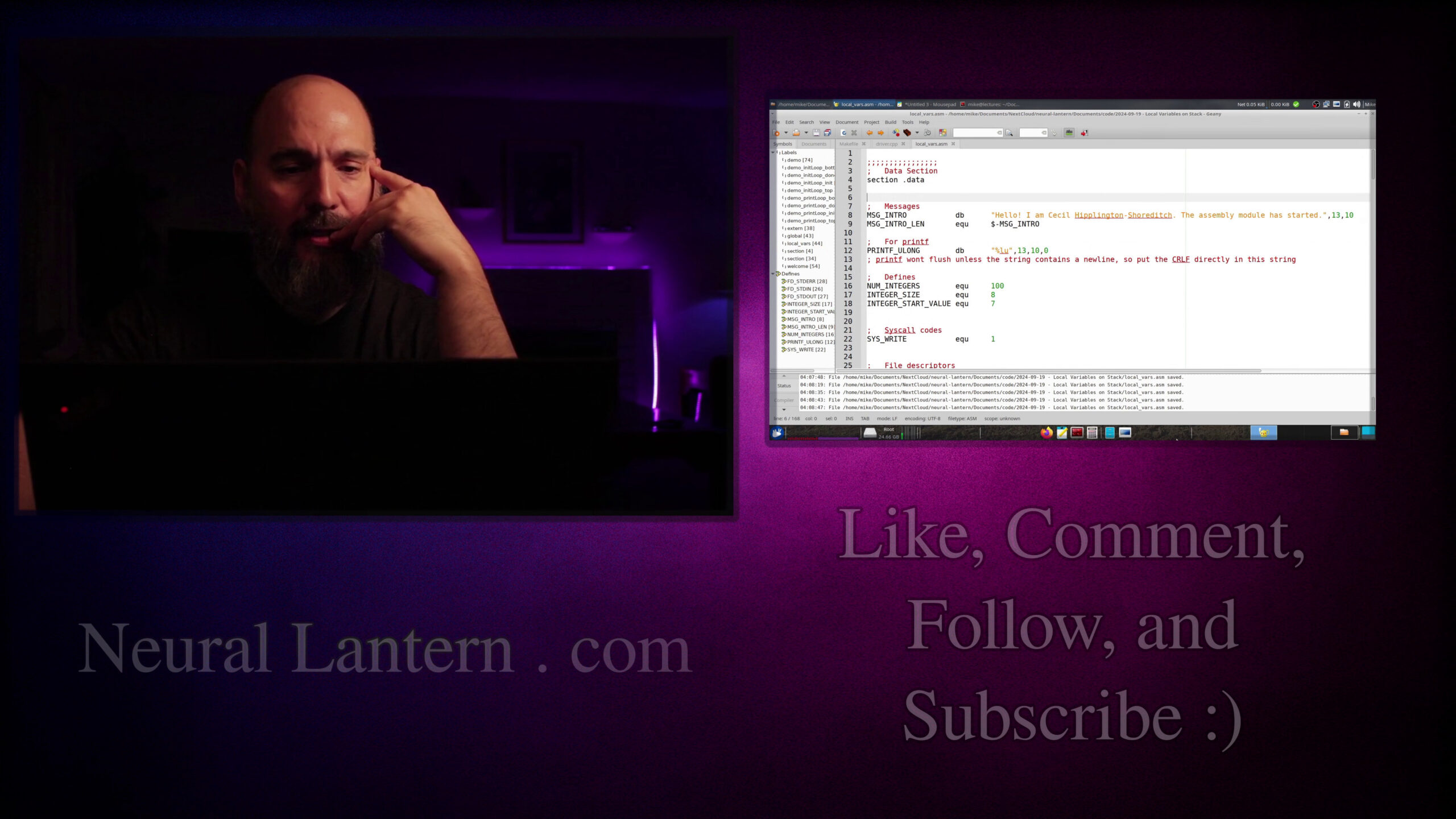 Learn how local variables are allocated on the stack in x86-64 assembly using YASM. See exactly how to reserve space, address variables with offsets, understand downward stack growth, and fix mysterious printf segfaults caused by 16-byte stack misalignment. Includes two alignment solutions and a complete working example with a local integer array.